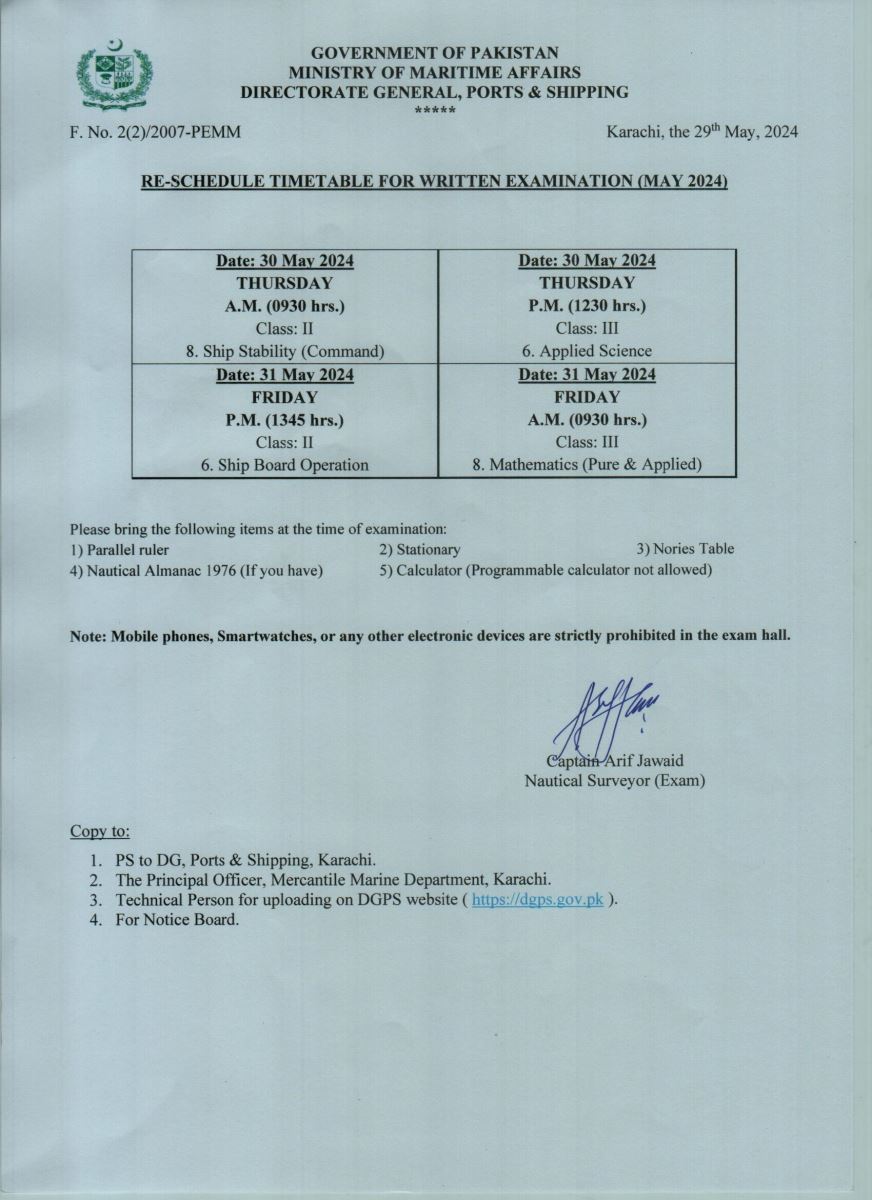 RESCHEDULE WRITTEN EXAMINATION FOR DECK OFFICER (20 MAY to 31 MAY, 2024)