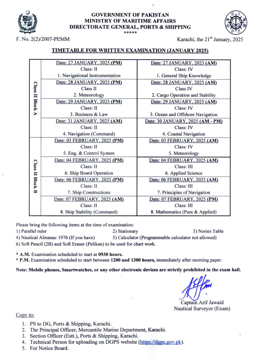 TIME TABLE: WRITTEN EXAMINATION FOR DECK OFFICER (JANUARY 2025)
