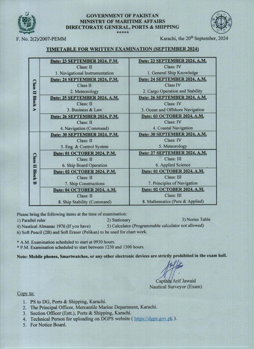 TIME TABLE: WRITTEN EXAMINATION FOR DECK OFFICER (SEPTEMBER 2024)