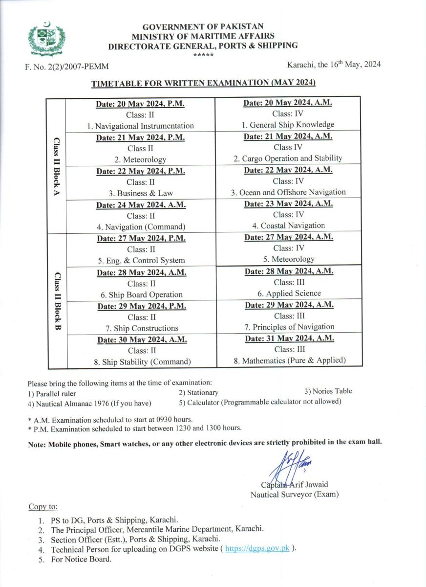 TIME TABLE: WRITTEN EXAMINATION FOR DECK OFFICER (20 MAY to 31 MAY, 2024)