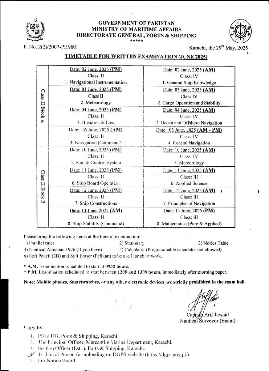 TIME TABLE: WRITTEN EXAMINATION FOR DECK OFFICER (JUNE 2025)