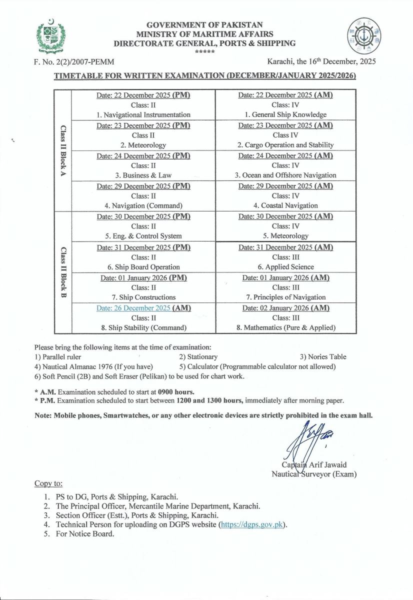 TIME TABLE: WRITTEN EXAMINATION FOR DECK OFFICER (DECEMBER 2025)