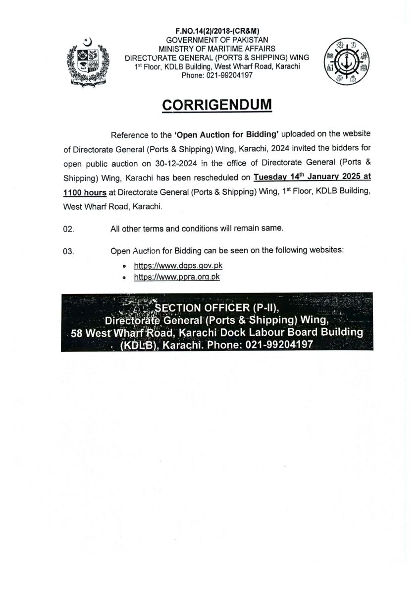 Corrigendum -- Auction will be carried out on Tuseday 14th January 2025 at 1100 hours in the office of Directorate General Ports & Shipping Wing, 1st Floor, KDLB Building, West Wharf Road, Karachi